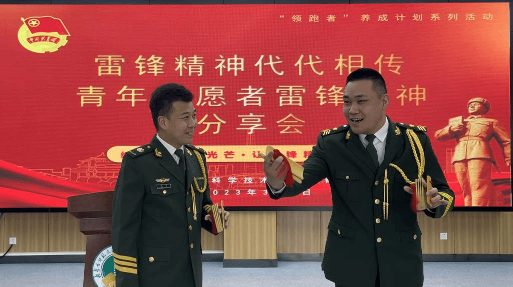 退役大学生士兵、全国数学建模大赛一等奖、自治区励志奖学金获得者、院学生会主席团成员、2020级空间防护班刁宝贵同学通过“退役不褪色、退伍不退志”角度,分享他在热血军营中淬炼学雷锋为民服务的经历,“清澈的爱,只为中国”,我们要争做新时代的排头兵、先锋队,继续将雷锋精神的种子播撒开去,将精神力量转化到实际行动中。