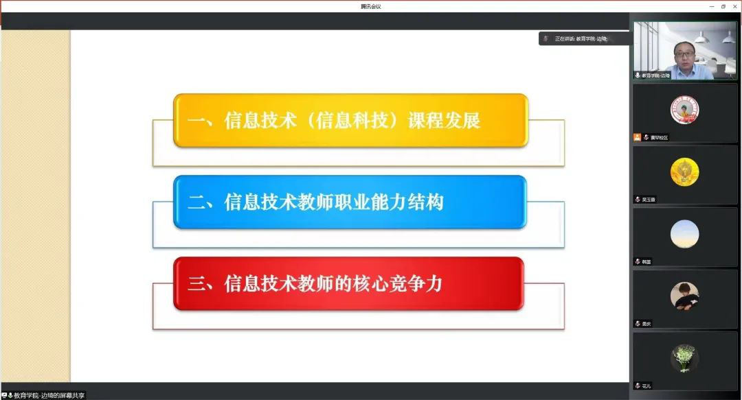 讲座中,边教授首先回顾了自1982年以来信息技术课程的发展历史。在此基础上,以现阶段中小学教学要求为导向,边教授分析了中小学校对信息技术教师的职业能力要求以及高校对计算机科学教育师范生的培养目标。最后,边教授重点讲解并与我院“课程论”建设方向的教师深入探讨了关于如何提升信息技术教师核心竞争力的培养重点。本次讲座为我院的师范生培养工作带来了很多思考与启发。