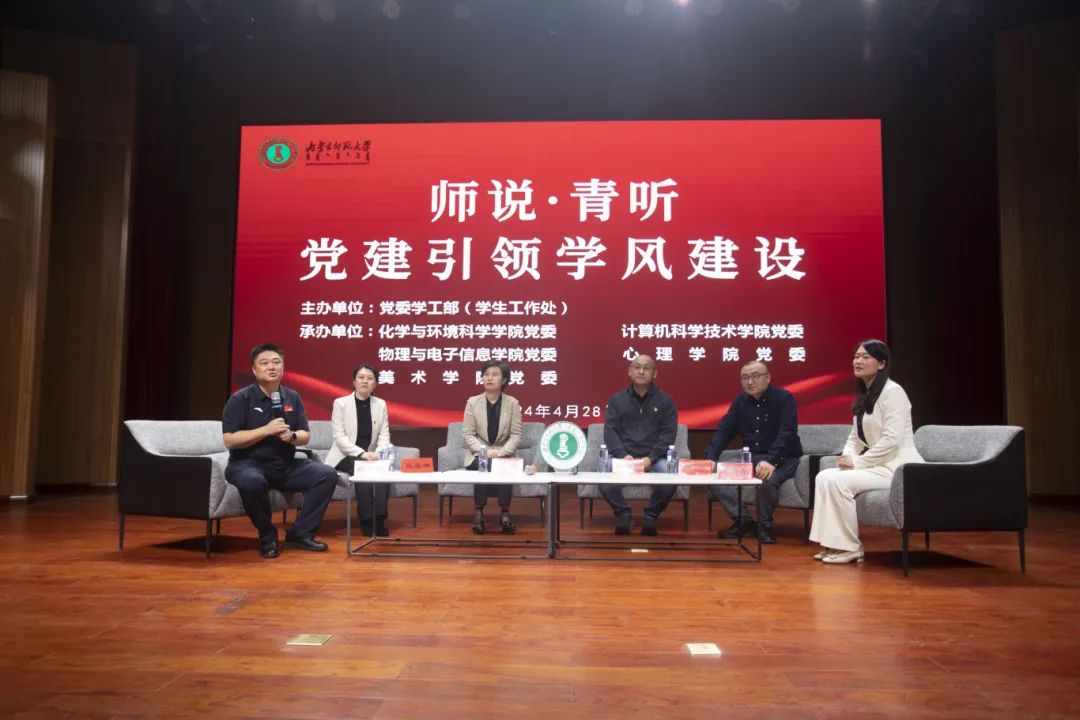 4月28日上午,由党委学工部(学生工作处)主办,yl6809永利官网集团党委、化学与环境科学学院党委、物理与电子信息学院党委、心理学院党委、美术学院党委承办的以“师说·青听 党建引领学风建设”为主题的圆桌沙龙在盛乐校区图书馆二楼报告厅举行。yl6809永利官网集团副院长柳林,美术学院党委副书记、副院长云双庆,化学与环境科学学院党委副书记、副院长范磊,心理学院党委书记、副院长张春林,物理与电子信息学院团总支书记宝力尔参加活动。yl6809永利官网集团团总支书记赵巍伟主持活动。